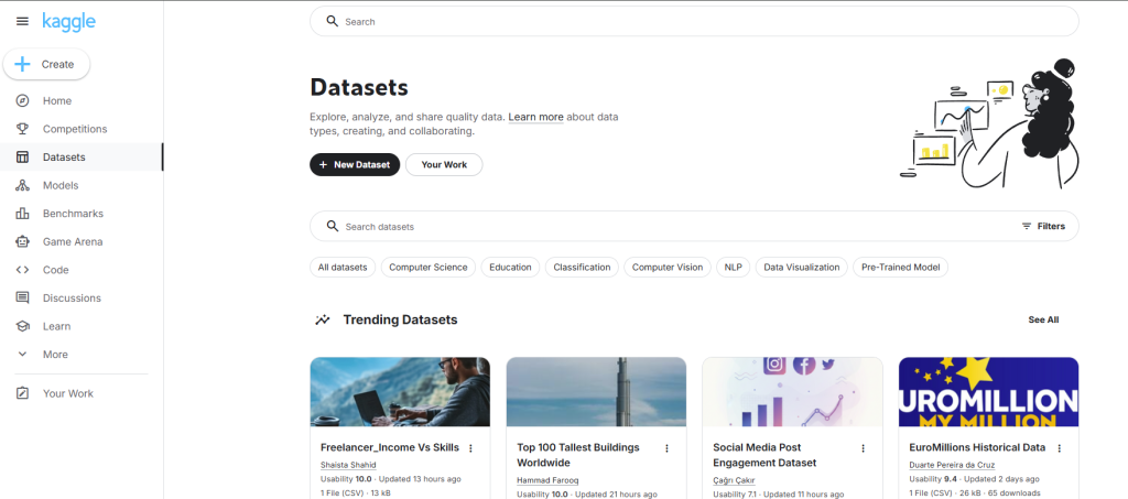 Kaggle-এ বিভিন্ন বিষয়ের অসংখ্য ডেটাসেট পাওয়া যায়।